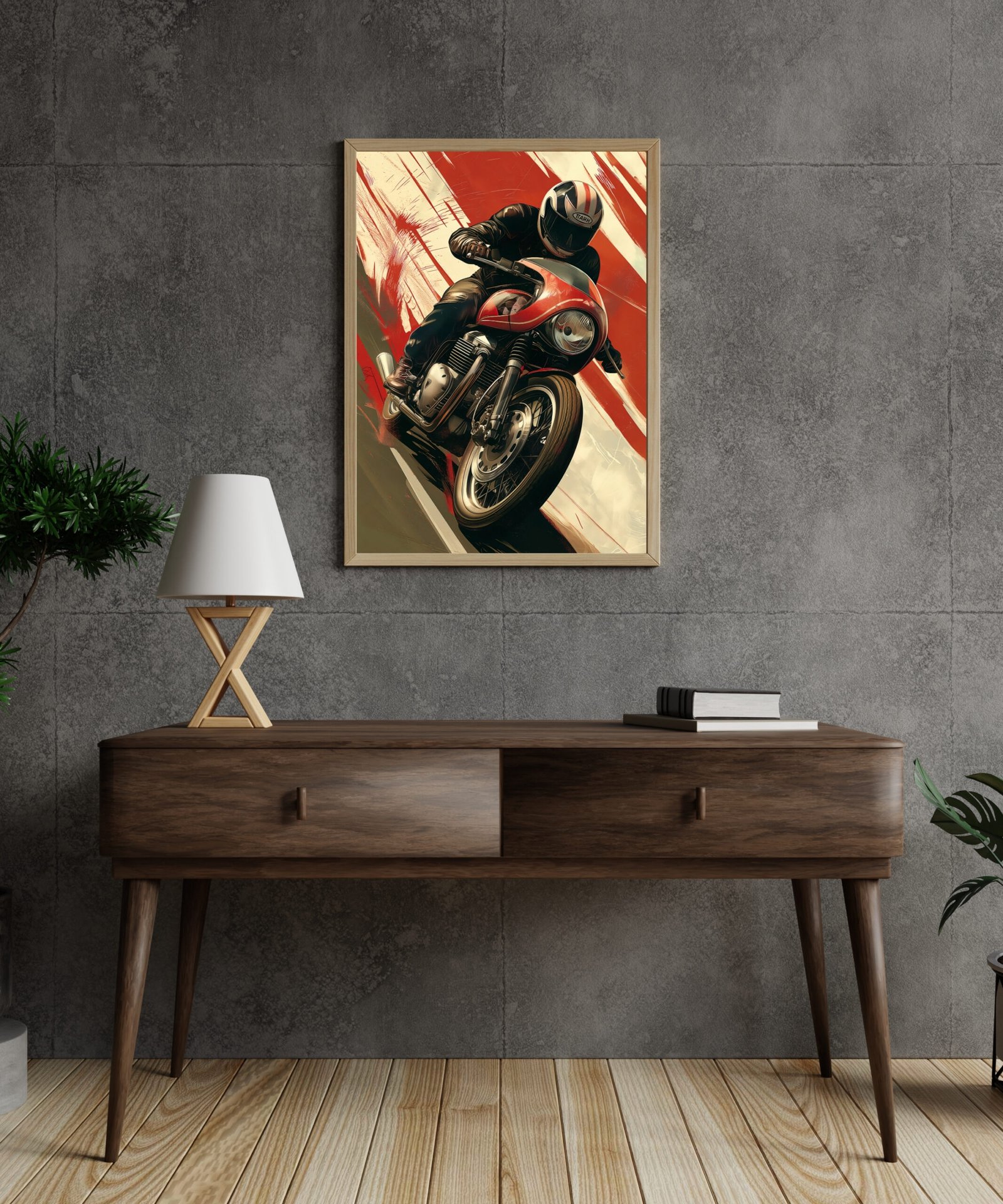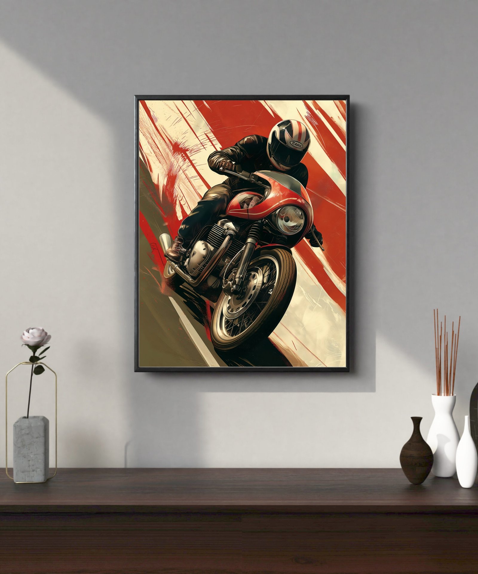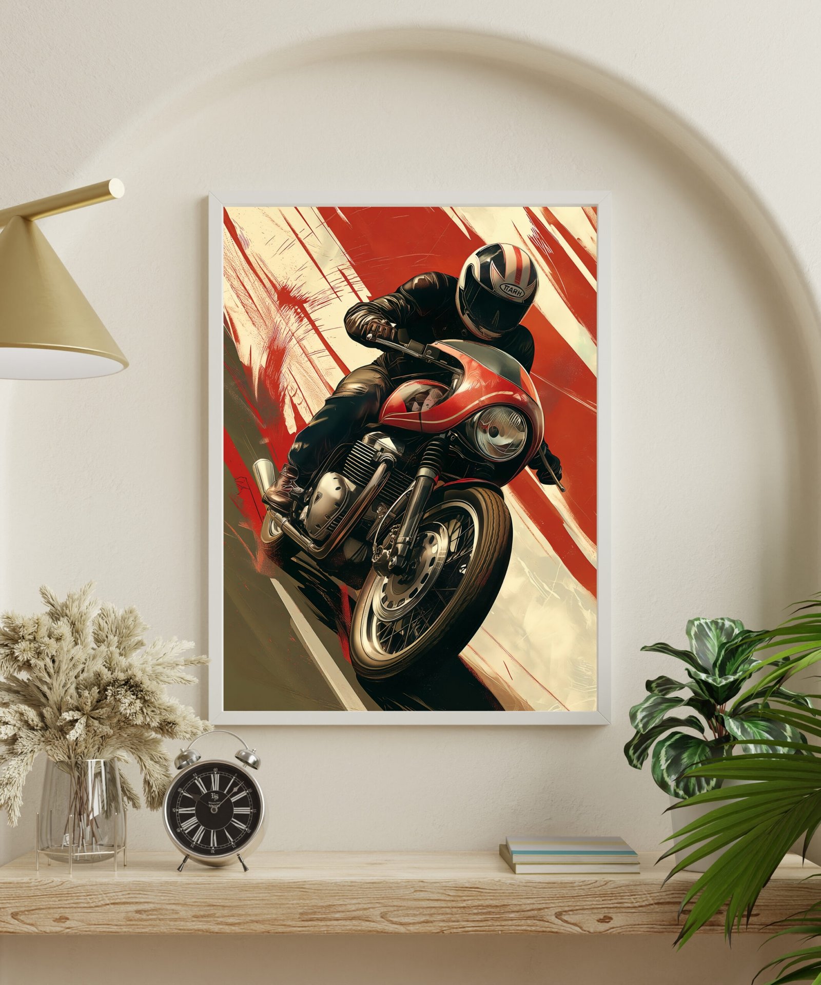 “Apex Predator” captures the thrilling moment a rider and machine become one. This dynamic illustration showcases a vintage-style cafe racer leaning hard into a turn, with expressive, energetic brushstrokes conveying speed and intensity. The fusion of retro style and modern artistic flair makes this a standout piece for any motorcycle racing enthusiast.
