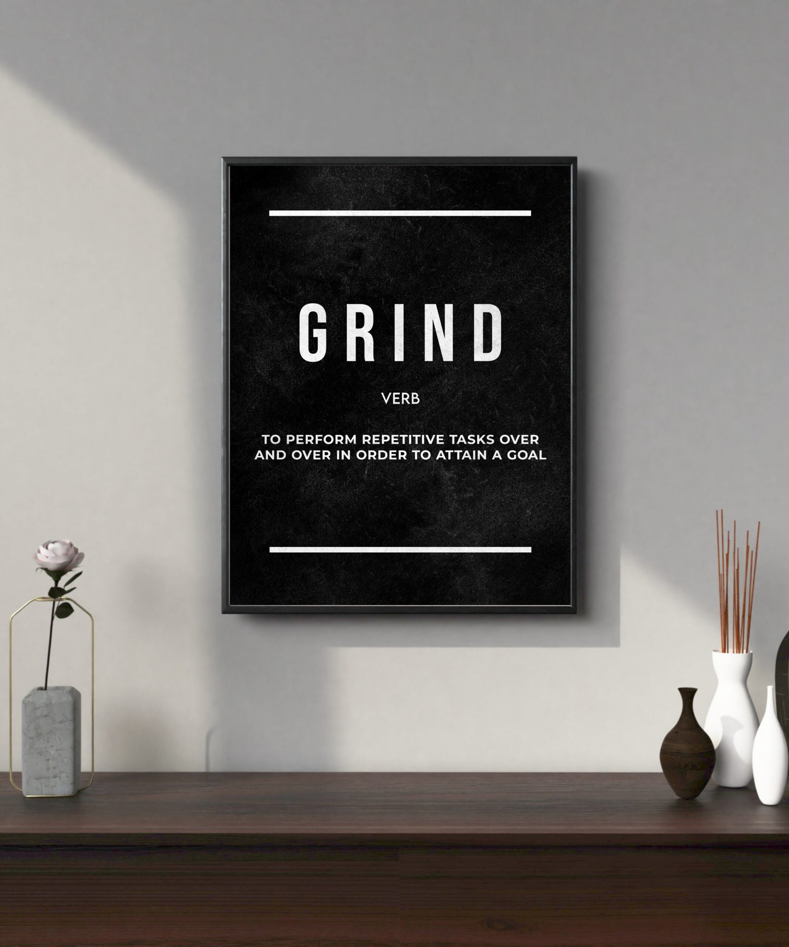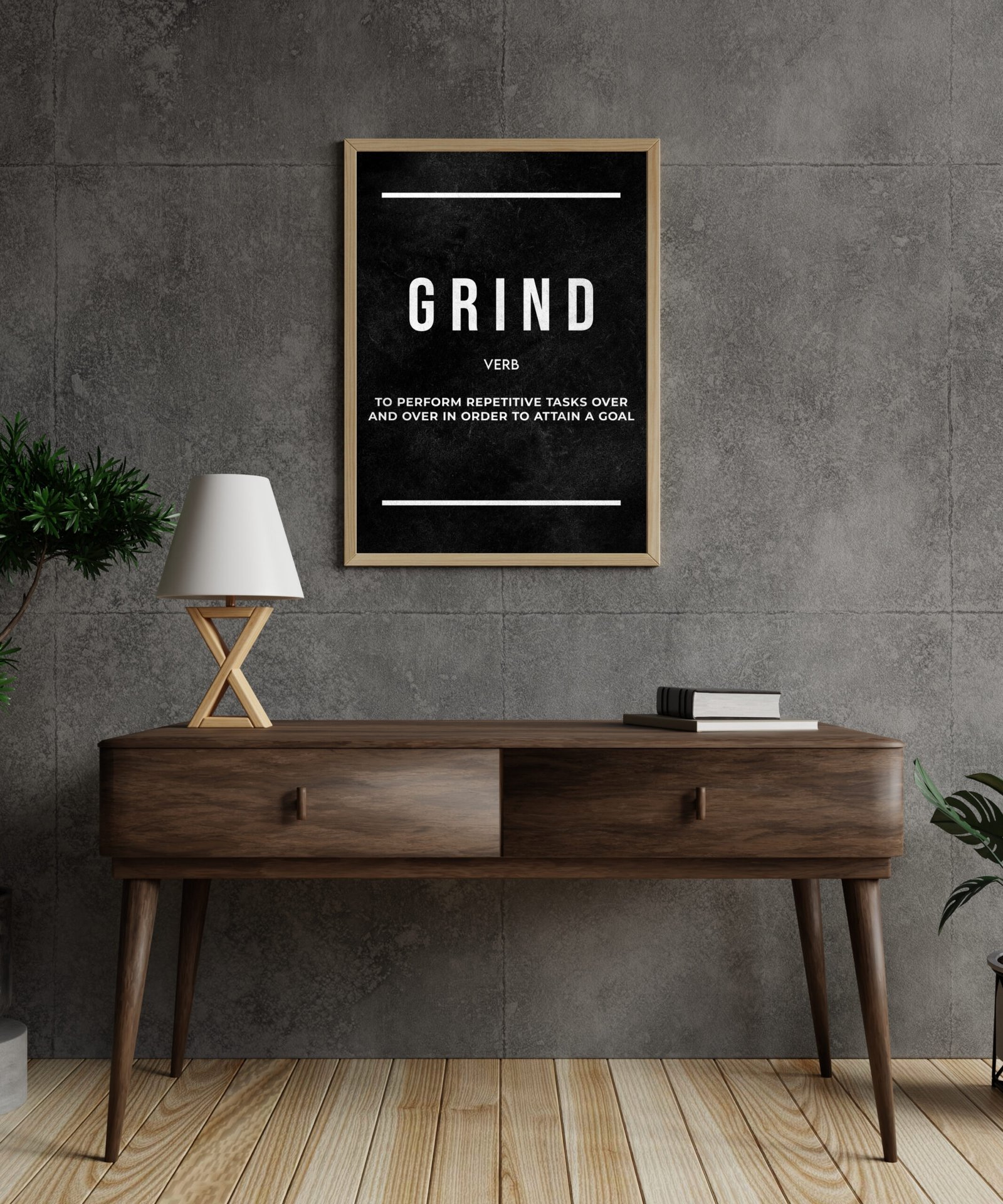 A minimalist and powerful print defining “Grind” as the repetitive tasks performed to attain a goal.